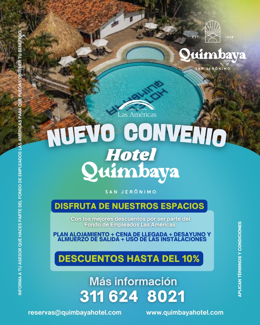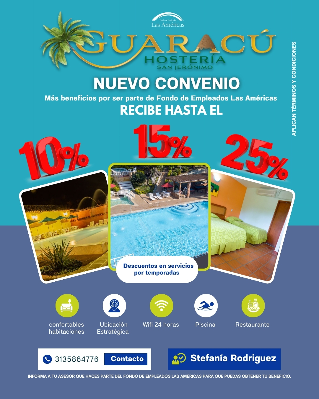 Porcentaje: Dia de sol sin ningún costo – hospedaje 4 personas en 1 habitación $120,000 más seguro hotelero y lo que consuman